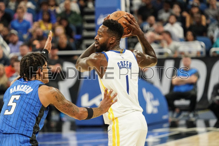 Orlando, Florida, USA, November 3, 2022, Golden State Warriors forward JaMychal Green #1 defends the ball from Paolo Banchero #5 in the first half at the Amway Center. (Photo Credit: Marty Jean-Louis)