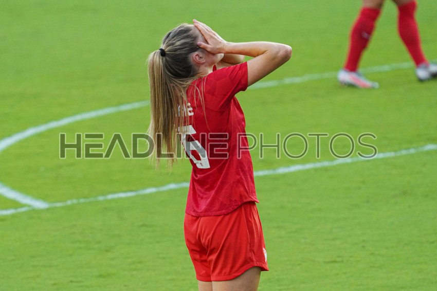 Orlando, Florida, USA, February 24, 2021, Canada forward Janine Beckie #16 reacts after missing opportunity to score during the SheBelieves Cup at Exploria Stadium (Photo Credit: Marty Jean-Louis)