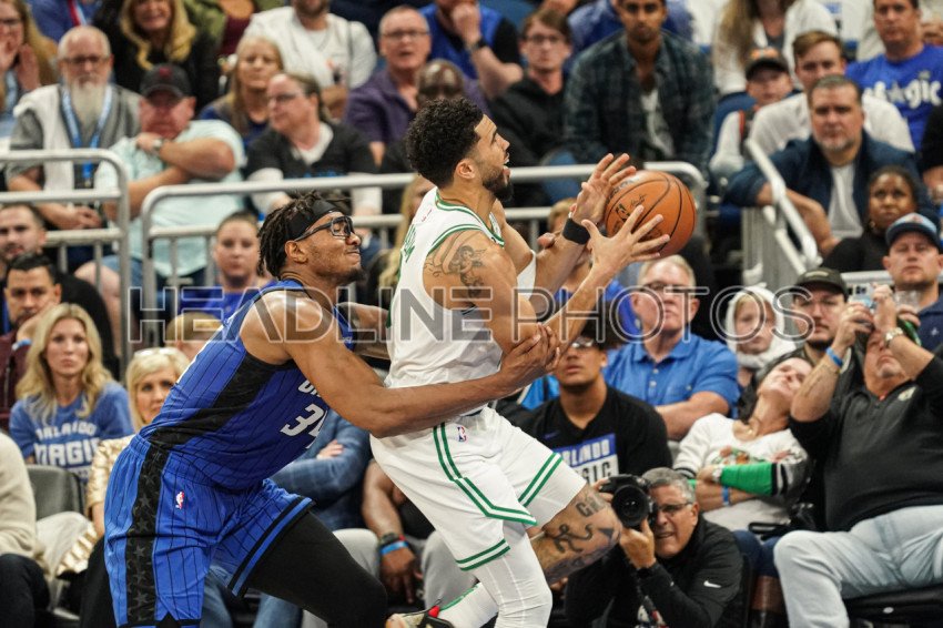 Orlando, Florida, USA, October 22, 2022, Boston Celtics forward Jayson Tatum #5 is fouled by Orlando Magic's Wendell Carter Jr #34 in the fourth quarter at the Amway Center. (Photo Credit: Marty Jean-Louis)
