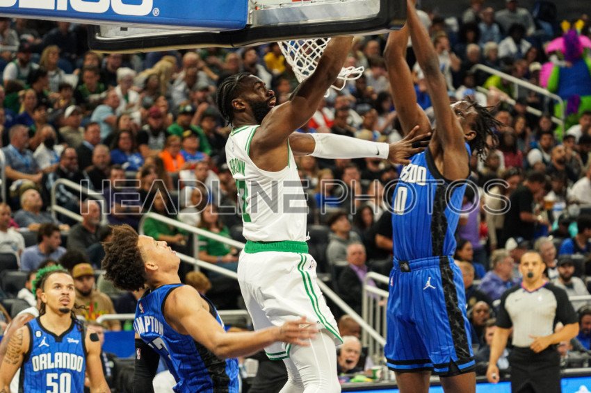 Orlando, Florida, USA, October 22, 2022, Boston Celtics Forward Jaylen Brown #7 attempt to make a basket but is fouled by Bol Bol #10 at the Amway Center. (Photo Credit: Marty Jean-Louis)
