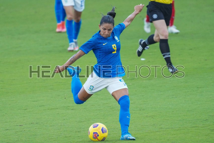 Orlando, Florida, USA, February 24, 2021, Brazil forward Debinha #9 makes a kick towards the goal during the SheBelieves Cup at Exploria Stadium (Photo Credit: Marty Jean-Louis)