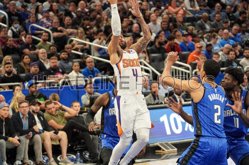 Orlando, Florida, USA, November 7, 2022, Phoenix Suns guard Duane Washington Jr. #4 shoots a three at the Amway Center. (Photo Credit: Marty Jean-Louis)
