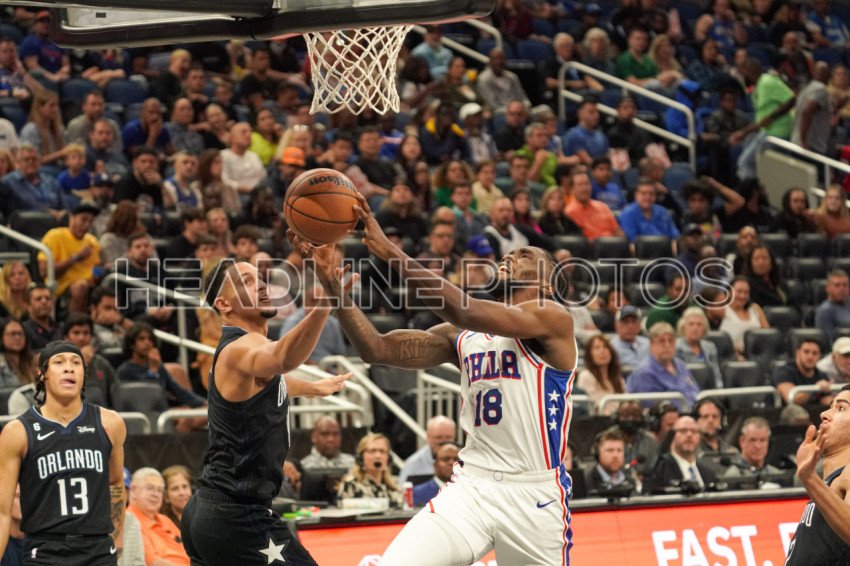 Orlando, Florida, USA, November 25, 2022, Philadelphia 76ers Guard Shake Milton #18 attempt to make a basket but is fouled by Jalen Suggs #4 at the Amway Center. (Photo Credit: Marty Jean-Louis)