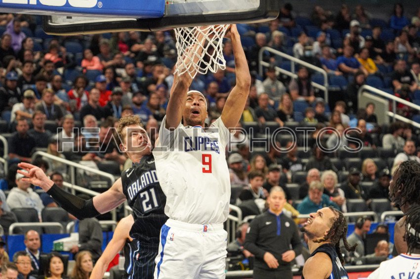 Orlando, Florida, USA, December 7, 2022, Los Angeles Clippers center Moses Brown #9 makes a dunk during the second half at the Amway Center. (Photo Credit: Marty Jean-Louis)