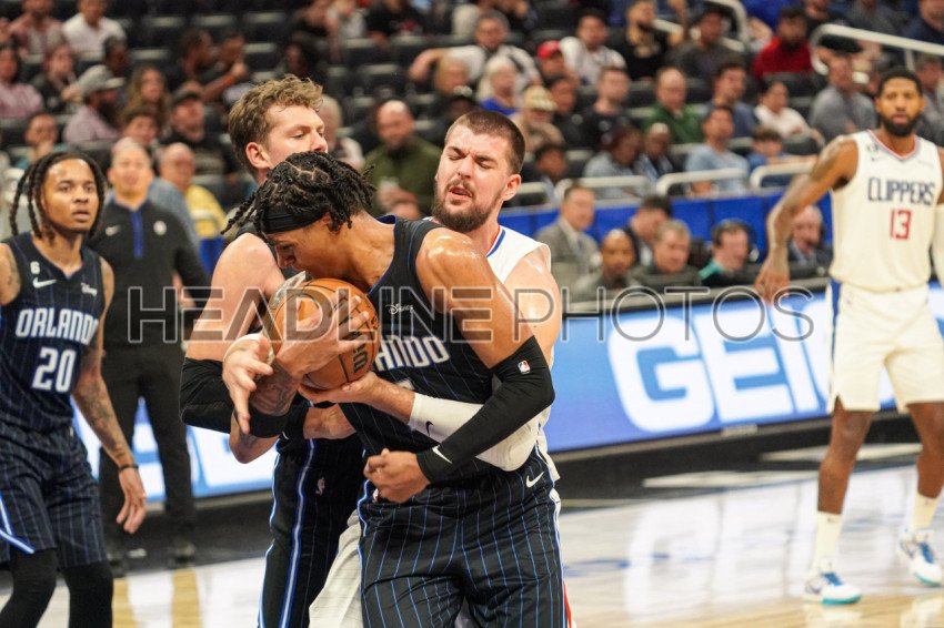 Orlando, Florida, USA, December 7, 2022, Los Angeles Clippers and Orlando Magic players Paolo Benchero #5 and Ivica Zubac #40 fight for the ball during the second half at the Amway Center. (Photo Credit: Marty Jean-Louis)