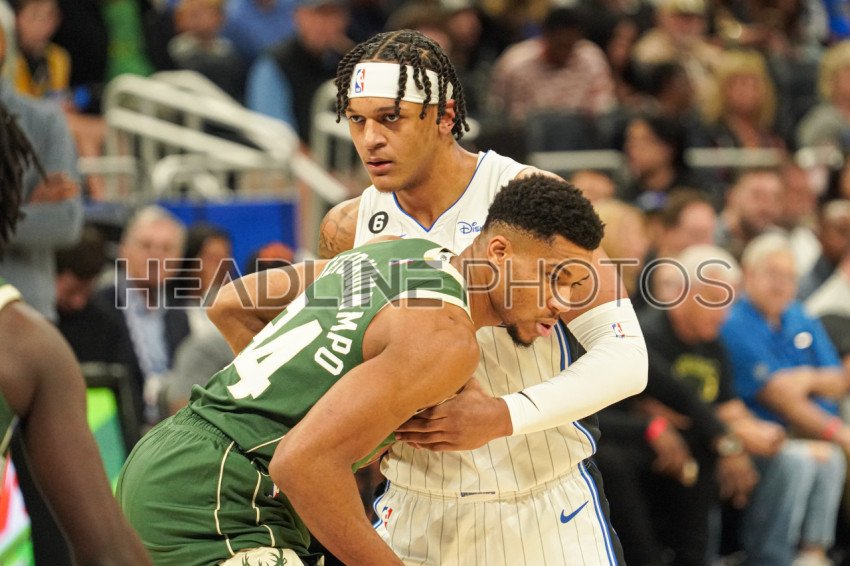 Orlando, Florida, USA, December 5, 2022, Giannis Antetokounmpo #34 and Paolo Banchero #5 during the first half at the Amway Center. (Photo Credit: Marty Jean-Louis)