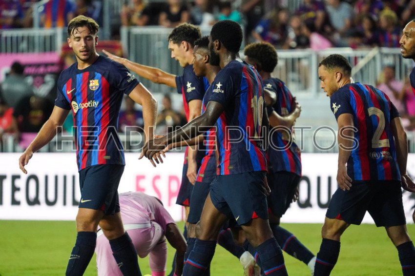Fort Lauderdale, Florida, USA, July 19, 2022, FC Barcelona players celebrate after scoring against Inter Miami at DRV PNK Stadium in a Friendly Match. (Photo Credit: Marty Jean-Louis)
