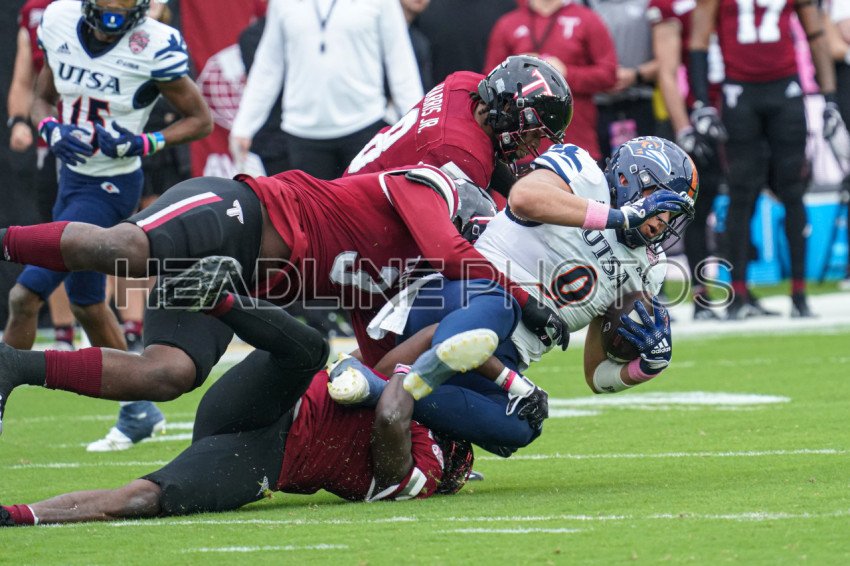 Orlando, Florida, USA, December 16, 2022, USTA Roadrunners player Brandon Brown #9 gets tackled by two Troy Trojans players in the first half at Exploria Stadium. (Photo Credit: Marty Jean-Louis)