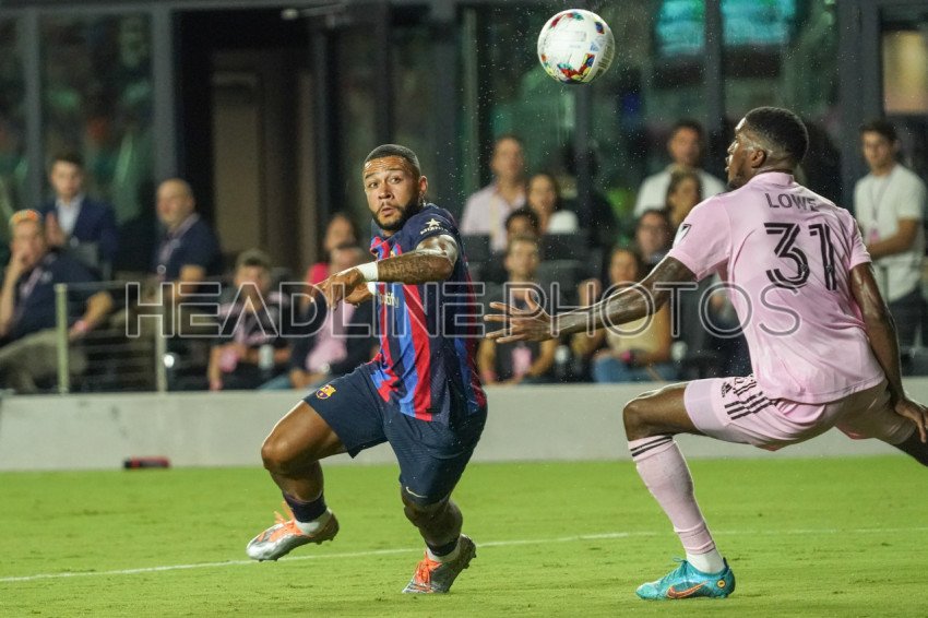Fort Lauderdale, Florida, USA, July 19, 2022, FC Barcelona player Memphis Depay #9 makes a pass to himself in the second half at DRV PNK Stadium in a Friendly Match. (Photo Credit: Marty Jean-Louis)