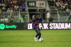 Fort Lauderdale, Florida, USA, July 19, 2022, FC Barcelona forward Ousmane Dembele #7 controls the ball as he runs up field at DRV PNK Stadium in a Friendly Match. (Photo Credit: Marty Jean-Louis)