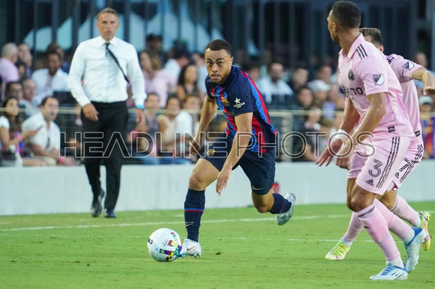 Fort Lauderdale, Florida, USA, July 19, 2022, FC Barcelona defender Sergino Dest #2 runs up field after receiving a pass in the first half at DRV PNK Stadium in a Friendly Match. (Photo Credit: Marty Jean-Louis)