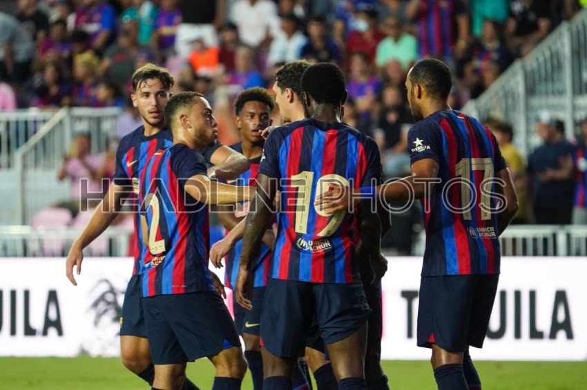 Fort Lauderdale, Florida, USA, July 19, 2022, FC Barcelona players celebrate after scoring against Inter Miami at DRV PNK Stadium in a Friendly Match. (Photo Credit: Marty Jean-Louis)