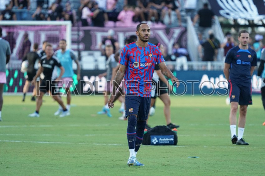 Fort Lauderdale, Florida, USA, July 19, 2022, FC Barcelona face player Pierre-Emerick Aubameyang warming up at DRV PNK Stadium in a Friendly Match. (Photo Credit: Marty Jean-Louis)