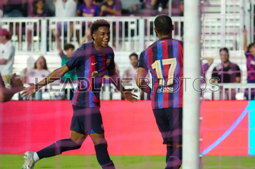 Fort Lauderdale, Florida, USA, July 19, 2022, FC Barcelona player Balde runs in celebration after gaol against Inter Miami at DRV PNK Stadium in a Friendly Match. (Photo Credit: Marty Jean-Louis)