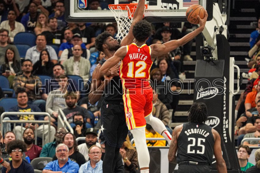 Orlando, Florida, USA, December 14, 2022, Atlanta Hawks forward De'Andre Hunter #12 attempt to make a dunk but is fouled by Mo Bamba #11 in the fourth quarter at the Amway Center. (Photo Credit: Marty Jean-Louis)
