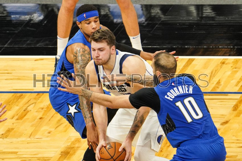 Orlando, Florida, USA, March 1, 2021, Dallas Mavericks player Luka Doncic #77 is doubled-teamed by the Orlando Magic players Evan Fournier and Chuma Okeke at the Amway Center (Photo Credit: Marty Jean-Louis)