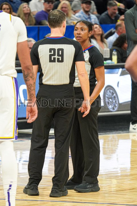 Orlando, Florida, USA, November 4, 2023, Two referees chat during the Los Angeles Lakers and Orlando Magic game at the Amway Center. (Photo Credit: Marty Jean-Louis)