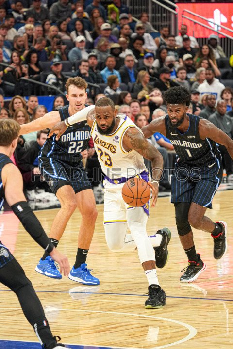 Orlando, Florida, USA, November 4, 2023, Los Angeles Lakers player Lebron James #23 runs forward as Jonathan Isaac #1 and Franz Wagner #22 runs behind during the first half at the Amway Center. (Photo Credit: Marty Jean-Louis)