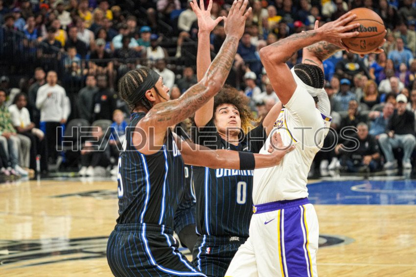Orlando, Florida, USA, November 4, 2023, Los Angeles Lakers' Anthony Davis #3 is doubled teamed by Anthony Black #0 and Paolo Banchero #5 at the Amway Center. (Photo Credit: Marty Jean-Louis)