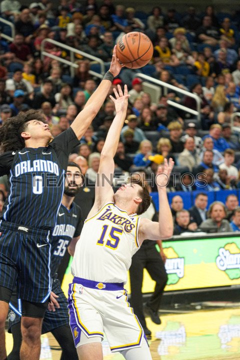 Orlando, Florida, USA, November 4, 2023, Los Angeles Lakers guard Austin Reaves #15 attempt to make a basket but is blocked by Anthony Black #0 at the Amway Center. (Photo Credit: Marty Jean-Louis)