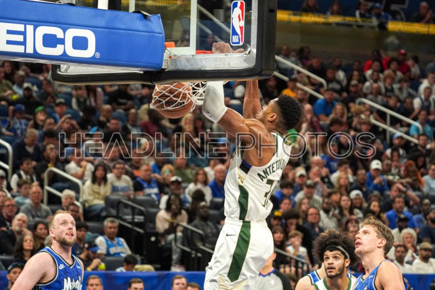 Orlando, Florida, USA, November 11, 2023, Milwaukee Bucks forward Giannis Antetokounmpo #34 makes a dunk during the second half at the Amway Center. (Photo Credit: Marty Jean-Louis)
