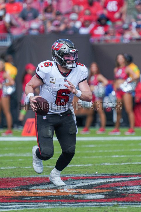 Tampa Bay, Florida, USA, November 12, 2023, Tampa Bay Buccaneers quarterback Baker Mayfield #6 makes a run at Raymond James Stadium. (Photo Credit: Marty Jean-Louis)