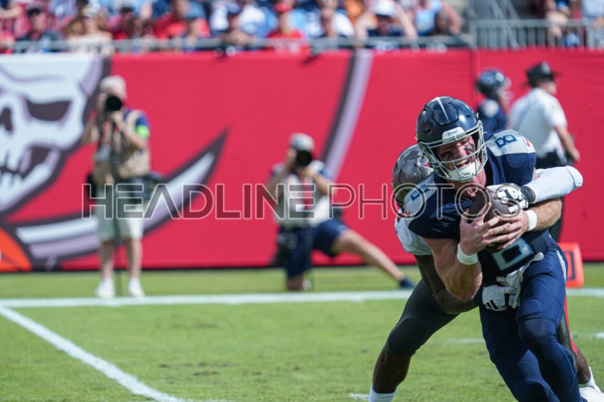 Tampa Bay, Florida, USA, November 12, 2023, Tennessee Titans quarterback Will Levis #8 gets tackled during the first half at Raymond James Stadium. (Photo Credit: Marty Jean-Louis)