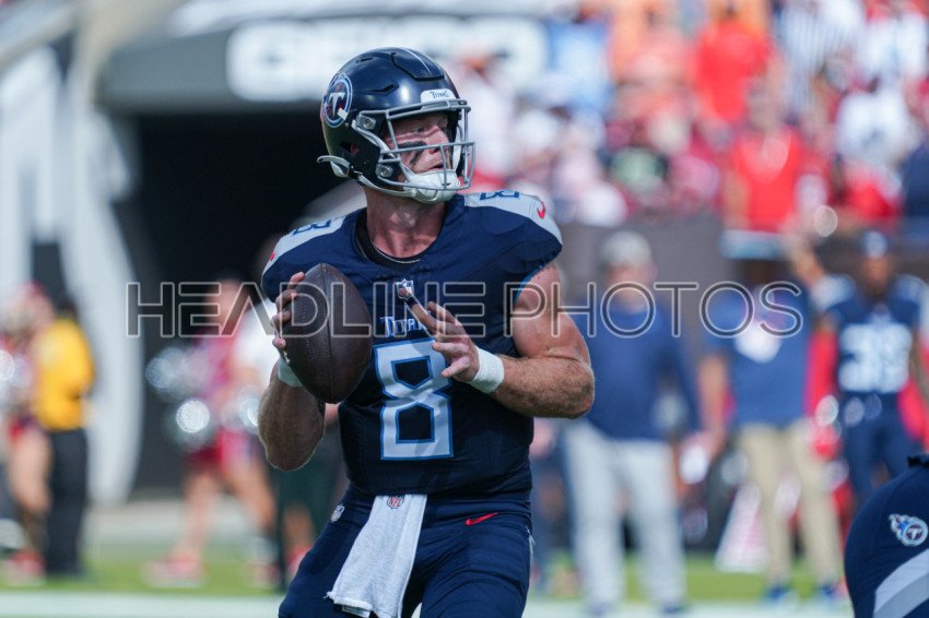 Tampa Bay, Florida, USA, November 12, 2023, Tennessee Titans quarterback Will Levis #8 readies to make a pass during the first half at Raymond James Stadium. (Photo Credit: Marty Jean-Louis)