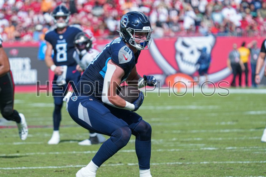 Tampa Bay, Florida, USA, November 12, 2023, Tennessee Titans Tight End Josh Whyle #81 makes a run at Raymond James Stadium. (Photo Credit: Marty Jean-Louis)