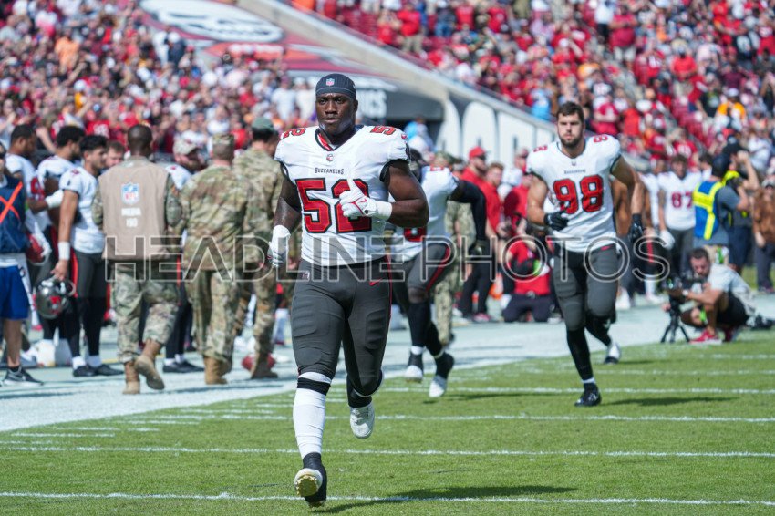 Tampa Bay, Florida, USA, November 12, 2023, Tampa Bay Buccaneers KJ Britt #52 warming up before the game at Raymond James Stadium. (Photo Credit: Marty Jean-Louis)