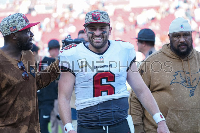Tampa Bay, Florida, USA, November 12, 2023, Tampa Bay Buccaneers quarterback Baker Mayfield #6 smiles after a win against the Tennessee Titans at Raymond James Stadium. (Photo Credit: Marty Jean-Louis)