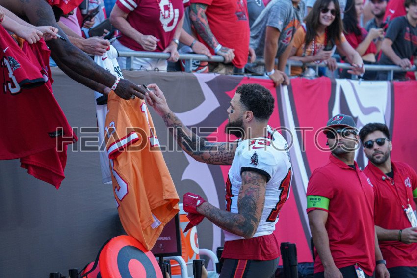 Tampa Bay, Florida, USA, November 12, 2023, Tampa Bay Buccaneers player Mike Evans signs a Jersey after a win against the Tennesee Titans at Raymond James Stadium. (Photo Credit: Marty Jean-Louis)