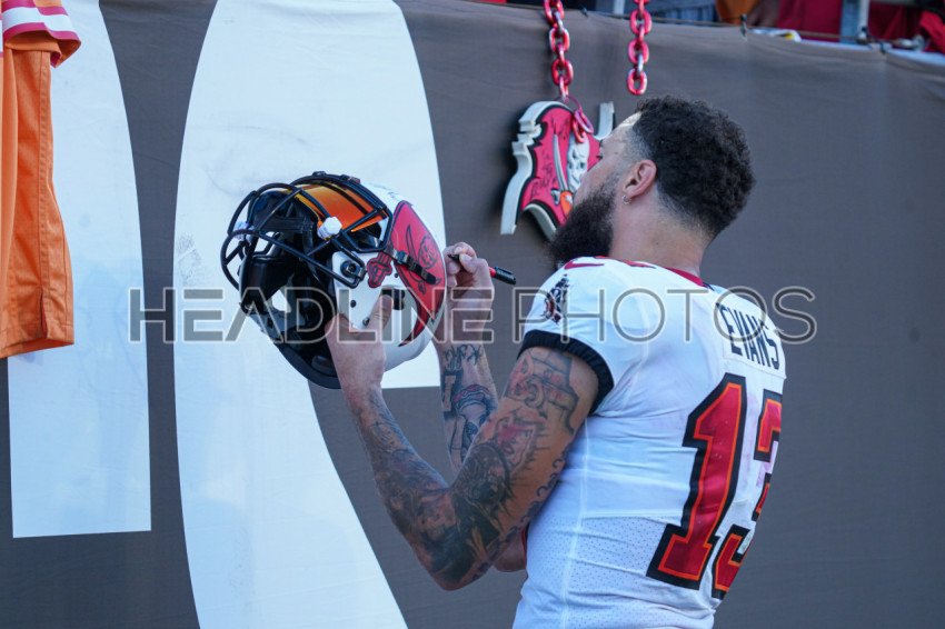 Tampa Bay, Florida, USA, November 12, 2023, Tampa Bay Buccaneers player Mike Evans signs a helmet after a win against the Tennesee Titans at Raymond James Stadium. (Photo Credit: Marty Jean-Louis)