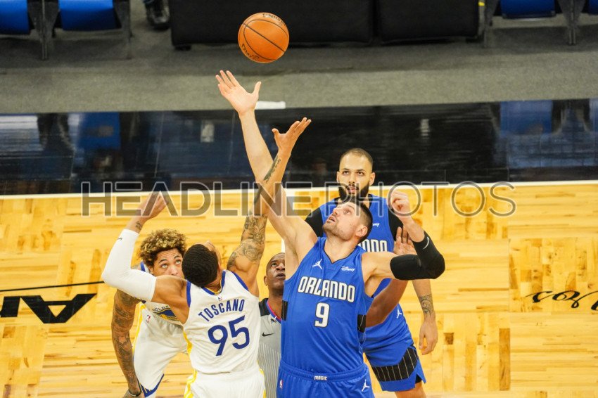 Orlando, Florida, USA, February 19, 2021, Tip off between the Golden State Warriors' Juan Toscano-Anderson #95 and the Orlando Magic's Nikola Vucevic #9 at the Amway Center (Photo Credit: Marty Jean-Louis)