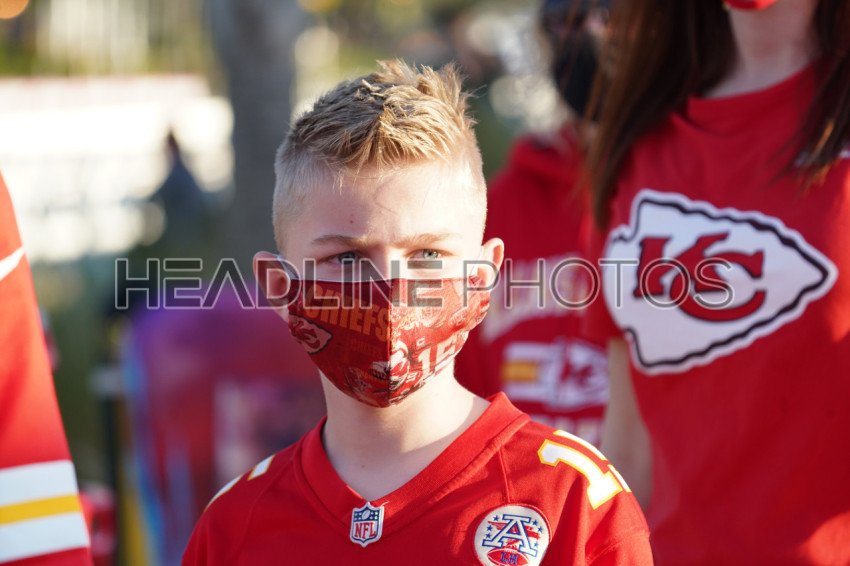 Tampa, Florida, USA, February 4, 2021, Little boy wearing a Kansas City Chiefs Face mask at the Super Bowl Experience (Photo Credit: Marty Jean-Louis)