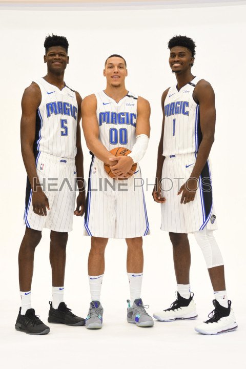(left to right) Mohamed Bamba, Aaron Gordon and Jonathan Isaac posing for photos during Media day at the Amway Center in Orlando, Florida. Photo Credit: Marty Jean-LouisPhoto Credit: Marty Jean-Louis