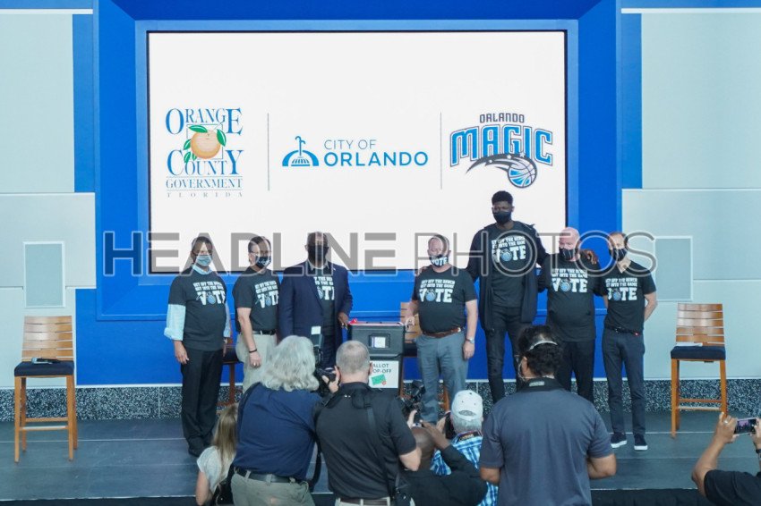 Orlando Magic CEO Alex Martins, Orange County Supervisor of Elections Bill Cowles, Orange County Mayor Jerry Demings, City of Orlando Mayor Buddy Dyer, announces Amway Center to open as early voting site for Orange County voters at the amway center in Orlando Florida USA on Wednesday September 2, 2020. Photo Credit: Marty Jean-Louis