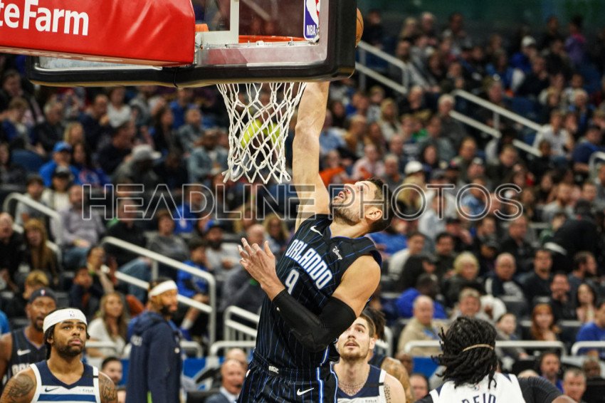 Orlando Magic player Nikola Vucevic #9 makes a basket at the Amway Center on Friday February 28, 2020 in Orlando Florida. Photo Credit: Marty Jean-Louis