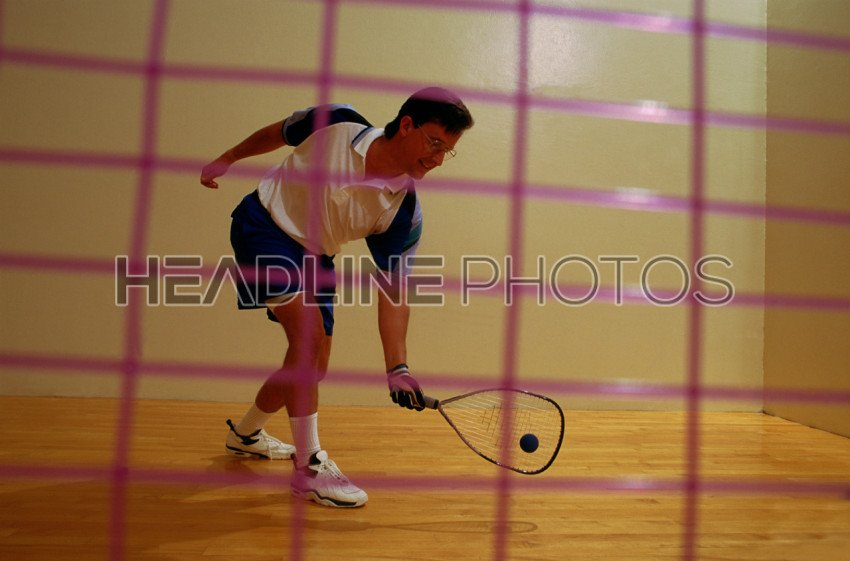 Co-ed trio playing racquetbal