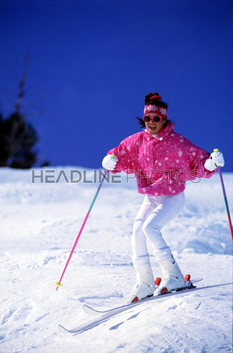 Woman skier skiing at sunny ski resort Amateur Winter Sports