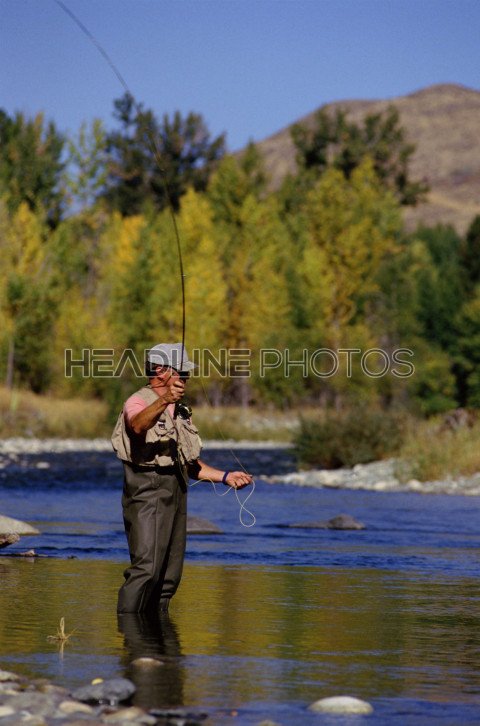 Rear view of mature fisherman casting on the river