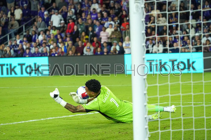 Orlando, Florida, USA, November 25, 2023, Orlando City SC goalkeeper Pedro Gallese #1 blocks the ball to make a save in the second half at Exploria Stadium. (Photo Credit: Marty Jean-Louis)