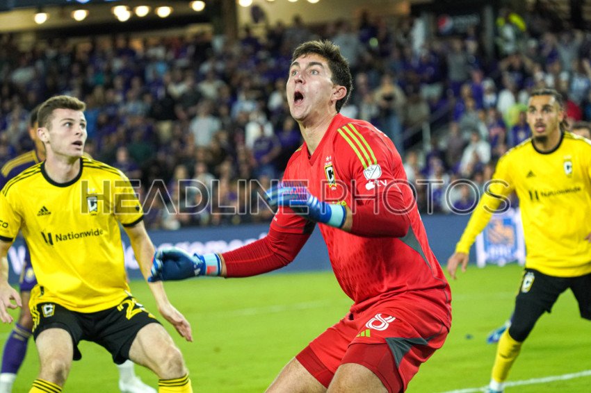 Orlando, Florida, USA, November 25, 2023, Columbus Crew goalkeeper Patrick Schulte #28 readies to make a save at Exploria Stadium. (Photo Credit: Marty Jean-Louis)