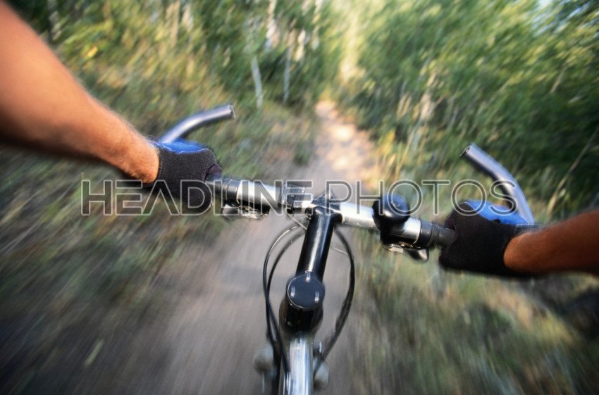 Mountain biking down hill descending fast on bicycle.