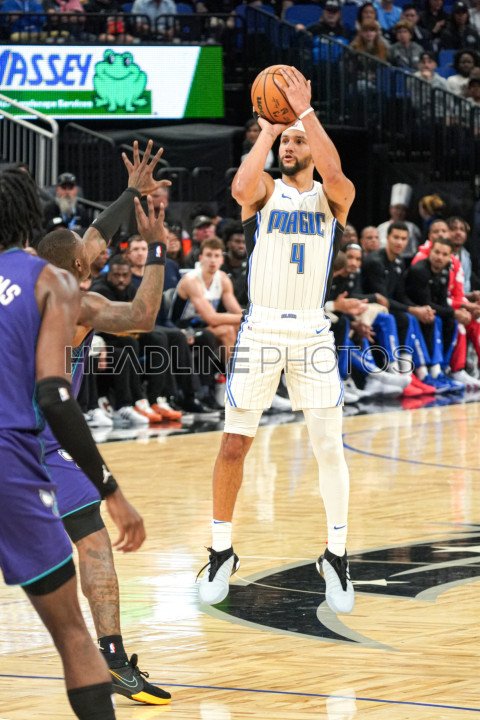 Orlando, Florida, USA, November 26, 2023, Orlando Magic guard Jalen Suggs #4 shoots a three in the first half at the Amway Center. (Photo Credit: Marty Jean-Louis)
