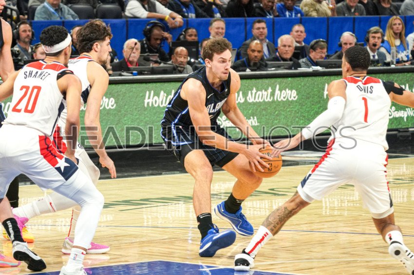 Orlando, Florida, USA, November 29, 2023, Orlando Magic forward Franz Wagner #22 attempt to run pass Wizards players at the Amway Center. (Photo Credit: Marty Jean-Louis)