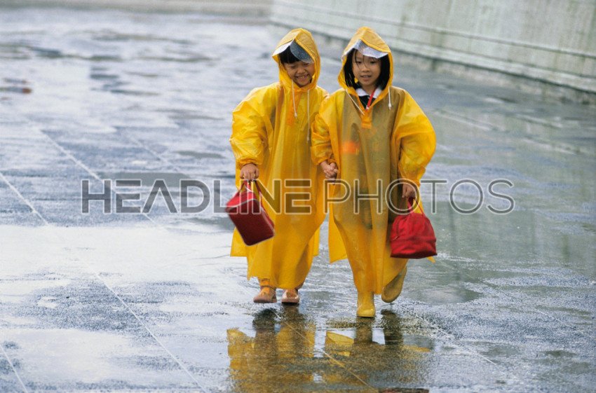 Little brother and sister. Funny children boy and girl in yellow identical suits play outdoors