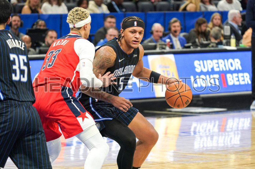 Orlando, Florida, USA, November 29, 2023, Orlando Magic forward Paolo Banchero #5 controls the ball as he receives pressure from Kyle Kuzma #33 at the Amway Center. (Photo Credit: Marty Jean-Louis)