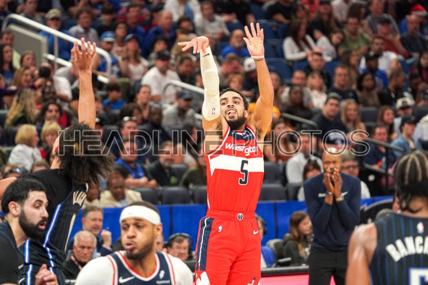 Orlando, Florida, USA, November 29, 2023, Washington Wizards guard Tyus Jones #5 shoots a three at the Amway Center. (Photo Credit: Marty Jean-Louis)