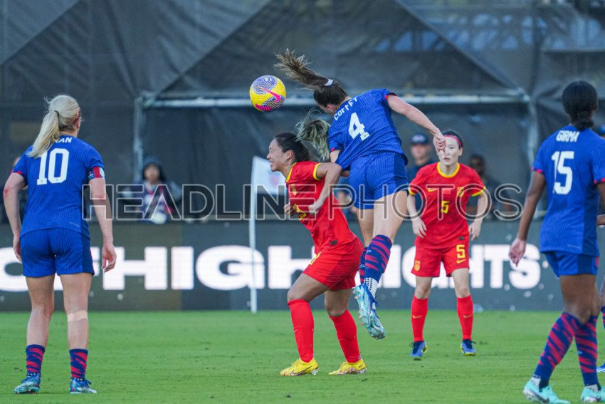 Fort Lauderdale, USA, December 2, 2023, U.S. National Women's Team player Sam Coffey #4 makes a header in a friendly match at DRV PNK Stadium. (Photo Credit: Marty Jean-Louis)